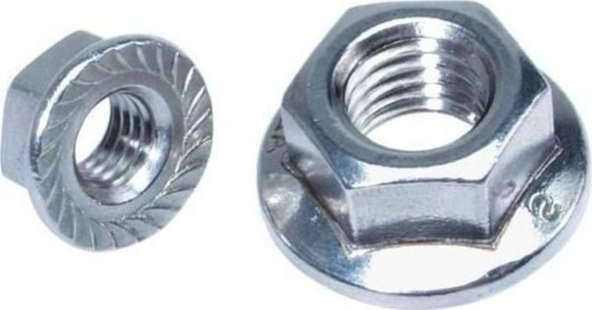 Гайка шестигранная с фланцем М20 DIN6923. Фланец гайки обеспечивает надежную фиксацию благодаря зубчатой поверхности. Используя такую гайку отподает необходимость в шайбах. Фланец увеличивает площадь давление и намного улучшает надёжность соединения. Насечки на фланце исключают самораскручивание гайки.