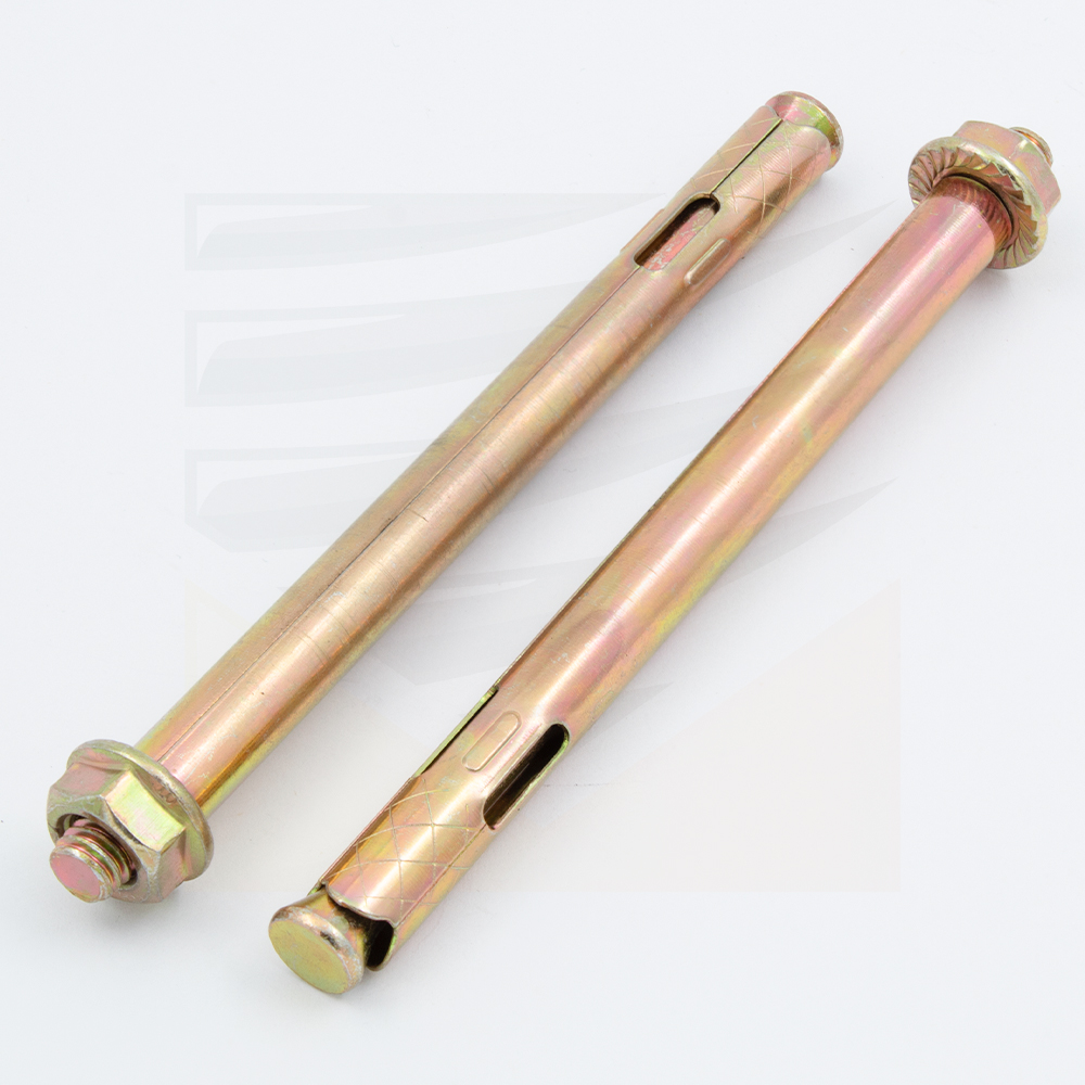 Анкерный болт с гайкой представляет из себя конструкцию состоящую из стальной гильзы (втулки), конусной шпильки с метрической резьбой и гайки-прокладки. В распорной части гильзы имеются надрезы, для упрощения процесса распирания при монтаже. При закручивании гайки конусная шпилька втягивается в металлическую втулку и распирает её. Расширение распорной части при монтаже обеспечивает надежное долговременное соединение. На конусной части у основания расположены насечки для более надежного крепления анкерного болта в материале.
