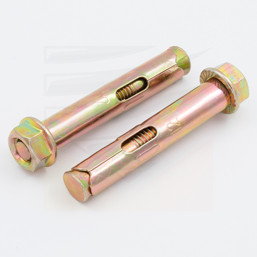 Анкерный болт с гайкой представляет из себя конструкцию состоящую из стальной гильзы (втулки), конусной шпильки с метрической резьбой и гайки-прокладки. В распорной части гильзы имеются надрезы, для упрощения процесса распирания при монтаже. При закручивании гайки конусная шпилька втягивается в металлическую втулку и распирает её. Расширение распорной части при монтаже обеспечивает надежное долговременное соединение. На конусной части у основания расположены насечки для более надежного крепления анкерного болта в материале.