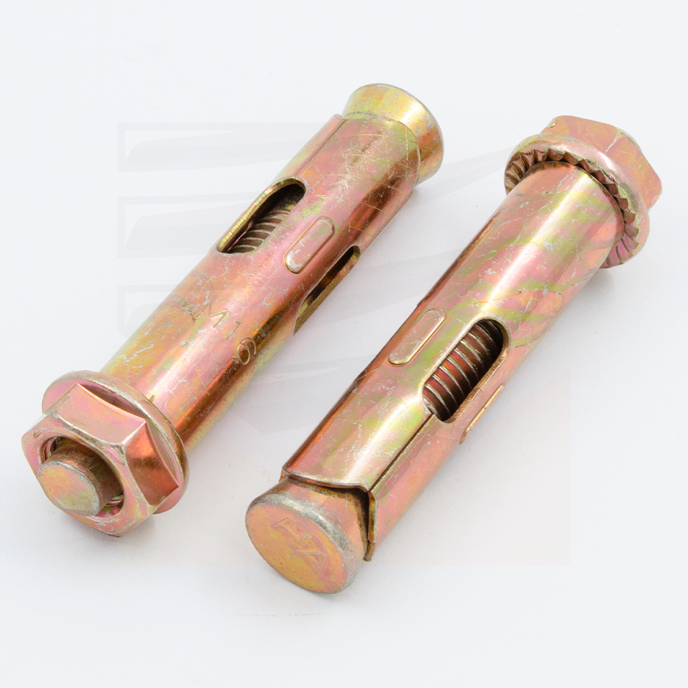 Анкерный болт с гайкой представляет из себя конструкцию состоящую из стальной гильзы (втулки), конусной шпильки с метрической резьбой и гайки-прокладки. В распорной части гильзы имеются надрезы, для упрощения процесса распирания при монтаже. При закручивании гайки конусная шпилька втягивается в металлическую втулку и распирает её. Расширение распорной части при монтаже обеспечивает надежное долговременное соединение. На конусной части у основания расположены насечки для более надежного крепления анкерного болта в материале.