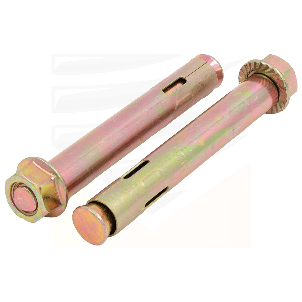 Анкерный болт с гайкой представляет из себя конструкцию состоящую из стальной гильзы (втулки), конусной шпильки с метрической резьбой и гайки-прокладки. В распорной части гильзы имеются надрезы, для упрощения процесса распирания при монтаже. При закручивании гайки конусная шпилька втягивается в металлическую втулку и распирает её. Расширение распорной части при монтаже обеспечивает надежное долговременное соединение. На конусной части у основания расположены насечки для более надежного крепления анкерного болта в материале.