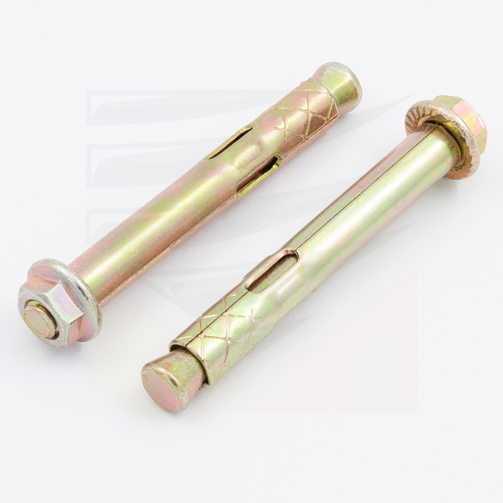 Анкерный болт с гайкой представляет из себя конструкцию состоящую из стальной гильзы (втулки), конусной шпильки с метрической резьбой и гайки-прокладки. В распорной части гильзы имеются надрезы, для упрощения процесса распирания при монтаже. При закручивании гайки конусная шпилька втягивается в металлическую втулку и распирает её. Расширение распорной части при монтаже обеспечивает надежное долговременное соединение. На конусной части у основания расположены насечки для более надежного крепления анкерного болта в материале.