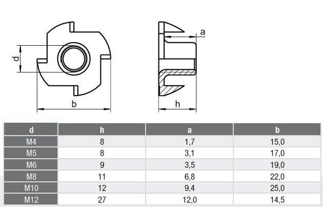 Гайка мебельная, врезная, забивная DIN 1624 предназначена для одностороннего монтажа при сборке мебели, а также конструкций из дерева, фанеры, ДСП и МДФ.