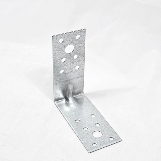Уголок крепёжный усиленный — металлическая пластина, согнутая под прямым углом. По центру проходит ребро жесткости. На обоих плечах (сторонах уголка) есть отверстия круглой формы: