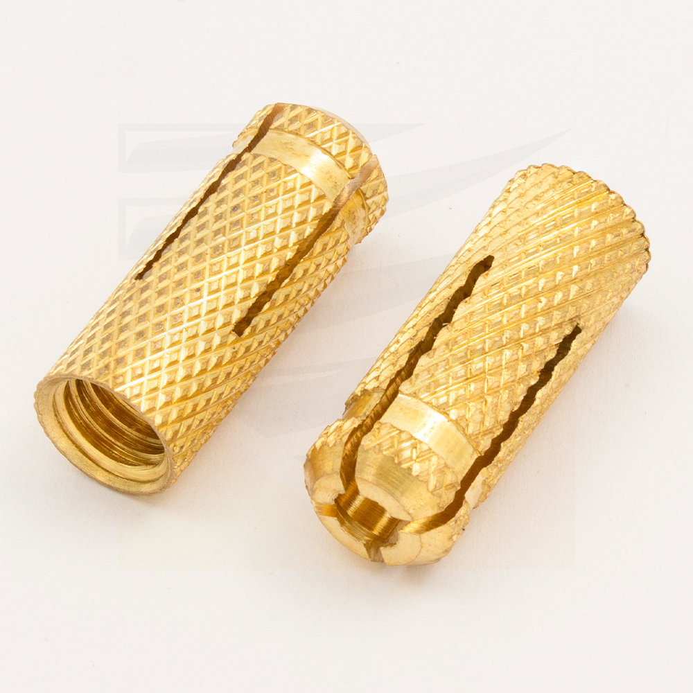 Забивной анкер представляет из себя латунную цангу, которая в силу мягкости металла изготовления, не имеет расклинивающего элемента и состоит из одной гильзы. Распирание происходит за счет вкручиваемого элемента. Гильза до половины рассечена на 4 части и имеет насечки для предотвращения проворачивания в бетоне. Латунная цанга дороже стальной, но благодаря материалу изготовления она прочнее крепиться в материале и может применяться в рыхлом материале, например кирпиче. Используется для крепления тяжелых конструкций и оборудования в стены и перекрытия из полнотелых материалов (бетон, натуральный камень, кирпич).
