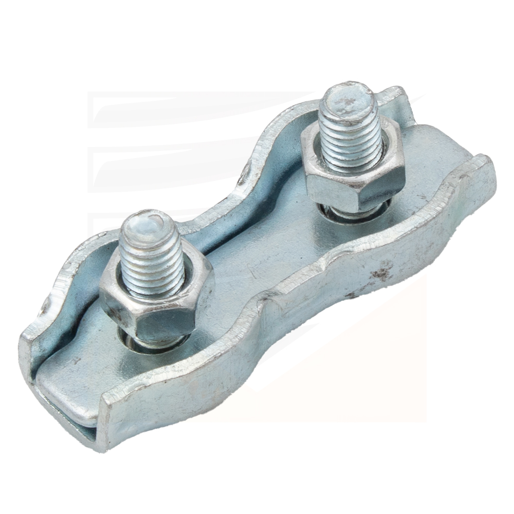 Зажим для тросов изготовлен из оцинкованной стали, предназначен для соединения тросов и изготовления перель на концах троса.