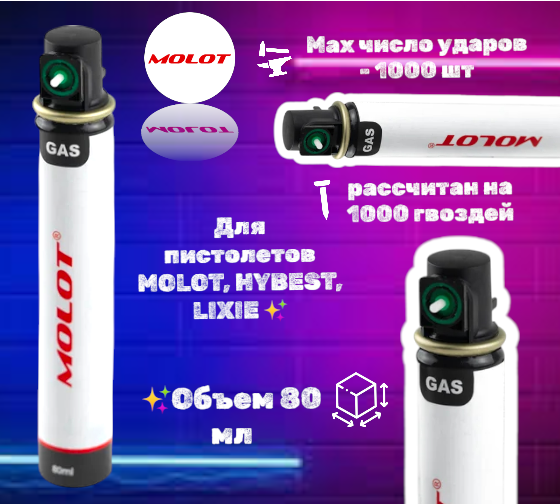 Газовый баллон GC 165-G от MOLOT (зеленый клапан) длиной 165 мм совместим с большинством газовых монтажных пистолетов, включая модели MOLOT, HYBEST и LIXIE!