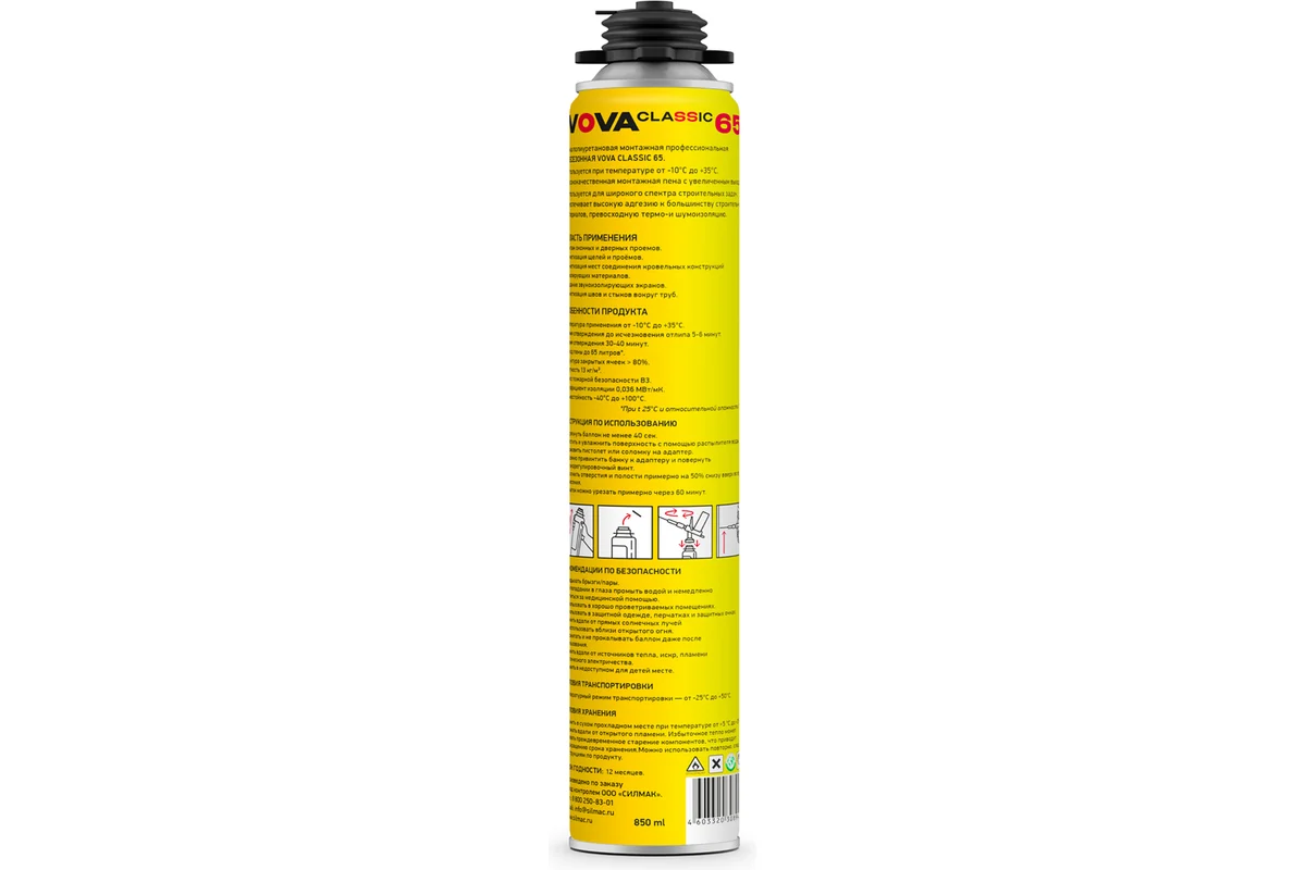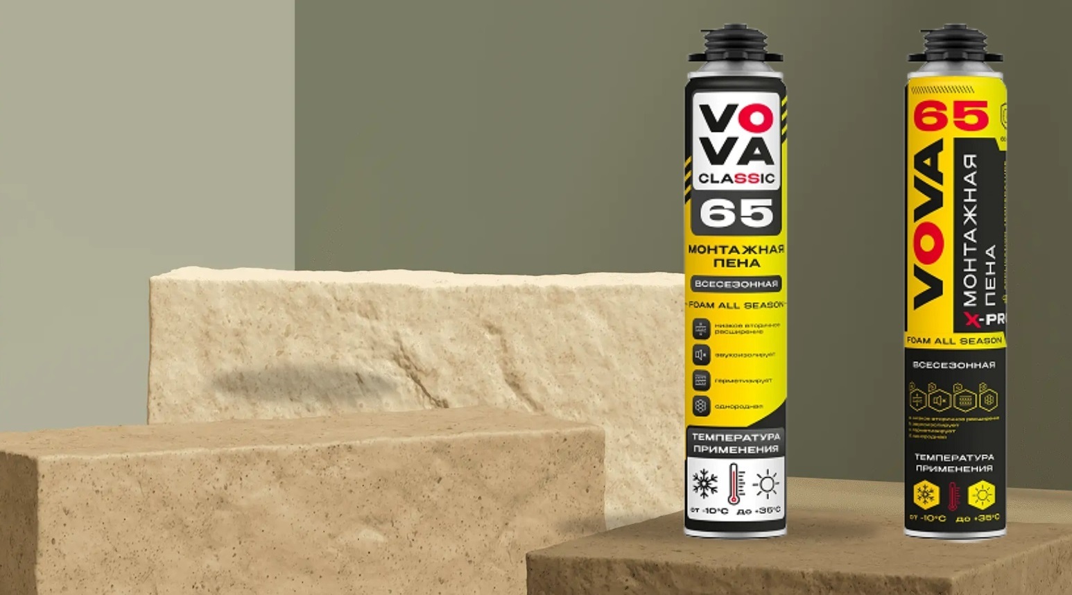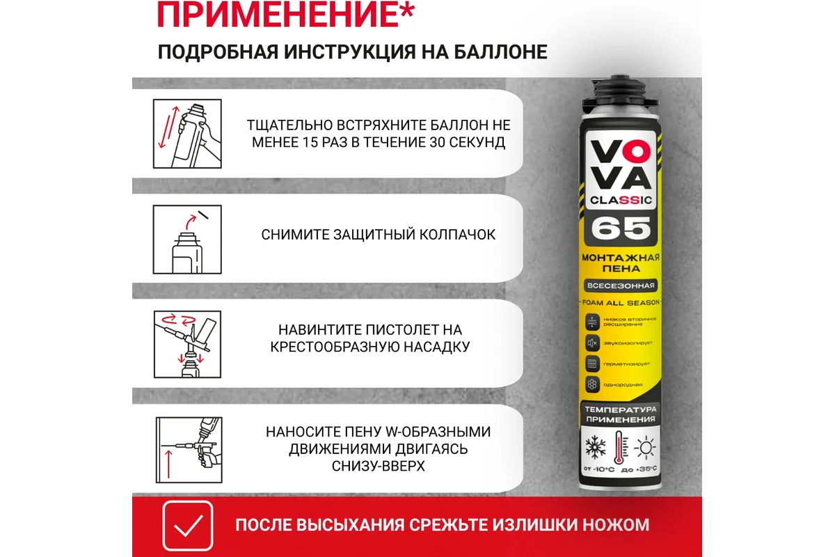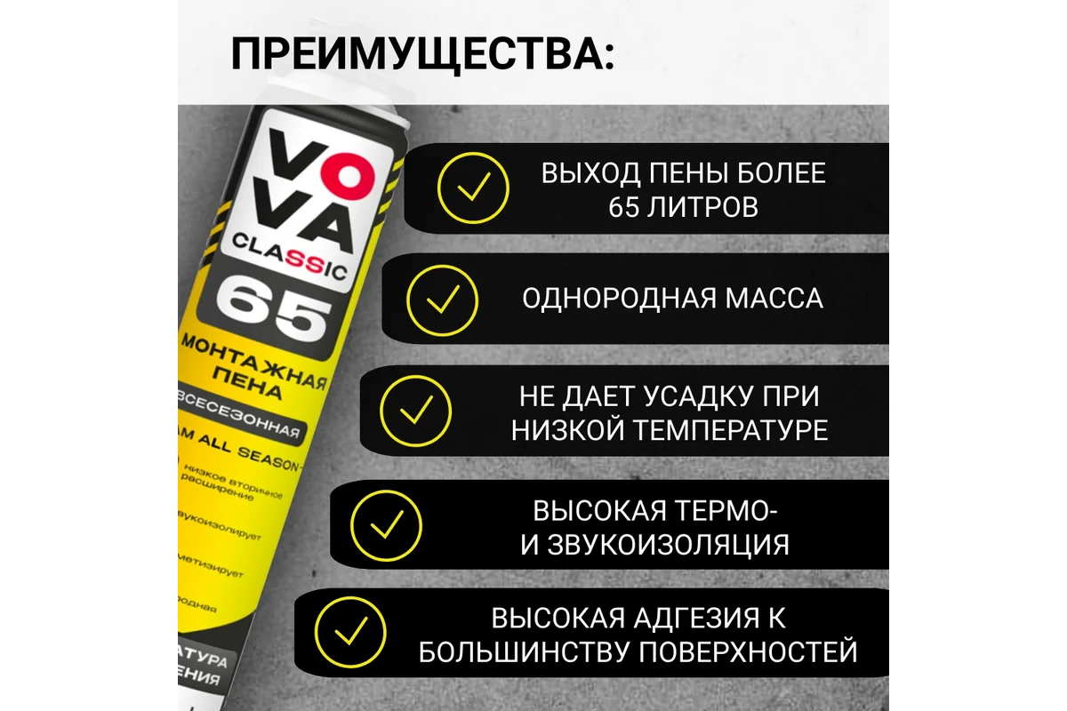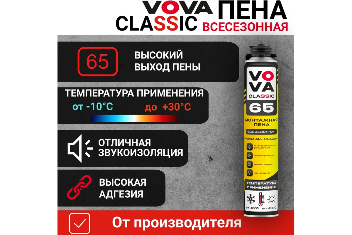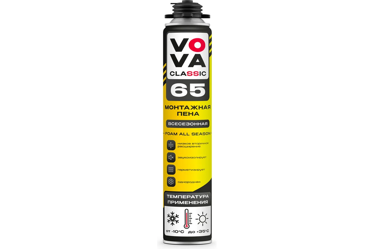 VOVA Classic – это профессиональная однокомпонентная полиуретановая монтажная пена, отличающаяся высокой адгезией и отличными тепло- и звукоизоляционными свойствами, что делает ее универсальным решением для множества строительных работ.